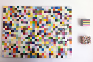 Recently there has been an explosion of paint chip DIY art projects on the internet. Matthew and I love the piece above made by one of his friends by cutting paint chips the same size, arranging them and gluing them onto a canvas. It hangs in our living room today. The small, acrylic paintings to the right of the paint chip piece are by artist Leah Rosenberg.